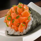 sushi tradicional com alga por dentro e arrroz por fora e gergelim sobreposto com lâmina de salmão em cima e recheio a escolha.