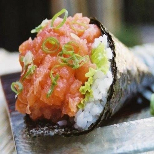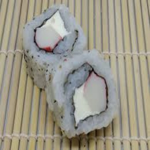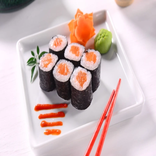 sushi tradicional com alga por fora e arroz por dentro.