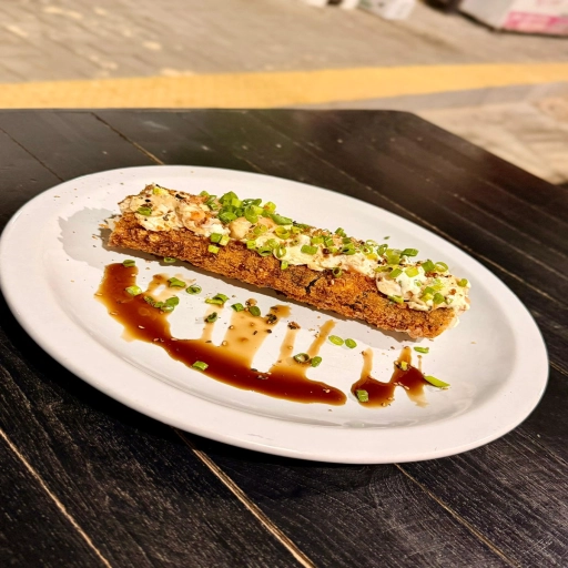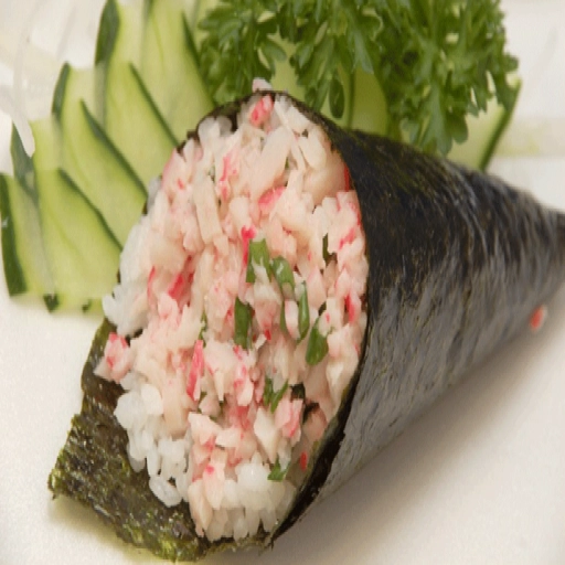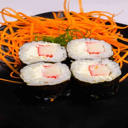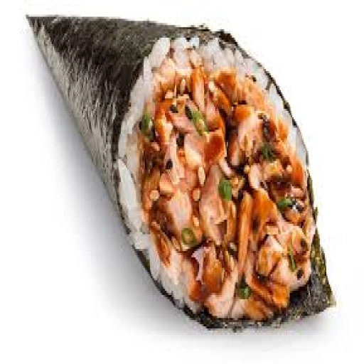 Alga nori em formato de cone, arroz japonês cream chesse é recheio a escolha empanado e frito.