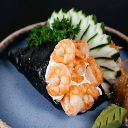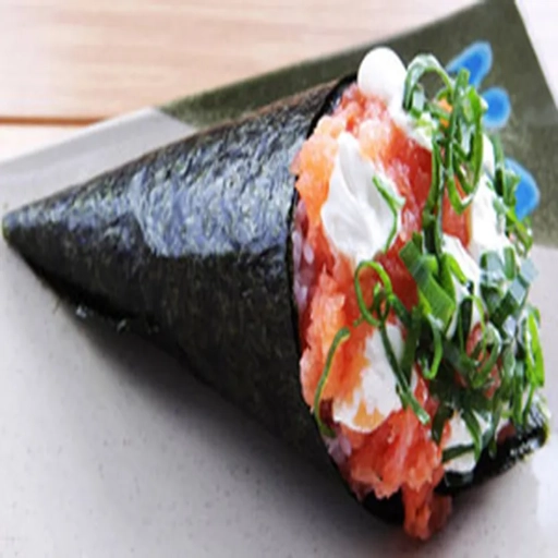 Alga nori em formato de cone, arroz japonês cream chesse é recheio a escolha.